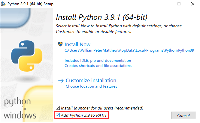 特别地,我们要在安装Python时选中Add Python 3.9 to PATH